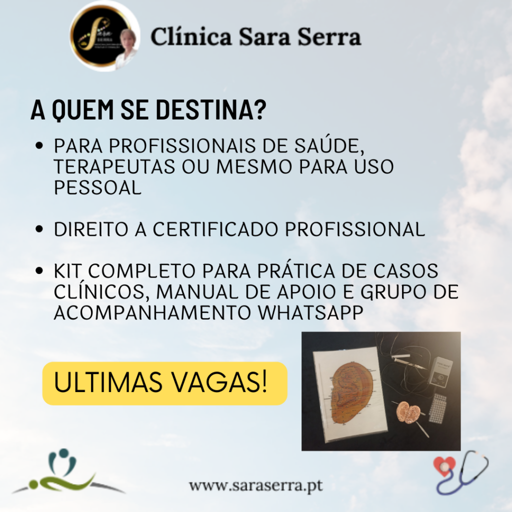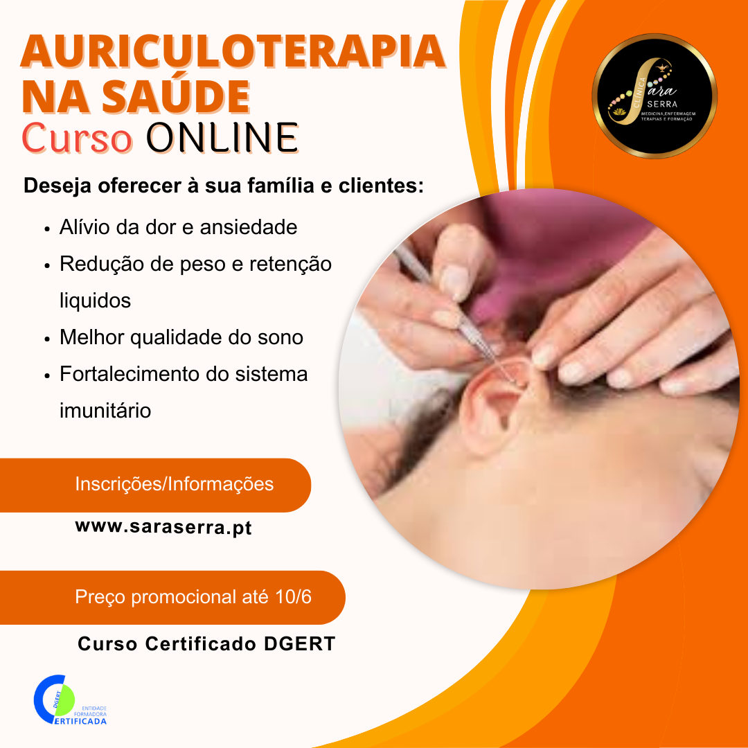 Não perca tempo e inscreva-se já na formação de “Auriculoterapia na Saúde” e adquira conhecimento de qualidade, certificado e reconhecido pela DGERT junto de uma profissional de saúde com mais de uma década de experiencia em formação nesta área.