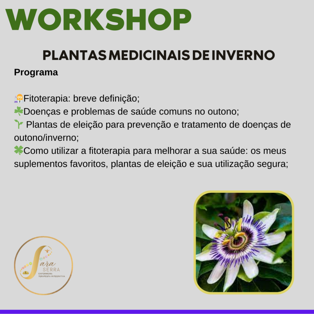 ????Este workshop é destinado a tod@s as pessoas que queiram conhecer técnicas eficazes na prevenção de problemas de saúde desta estação, como gripes, resfriados, otites, infeções respiratórias, entre outras, usando plantas medicinais e suplementos fitoterápicos de forma segura!